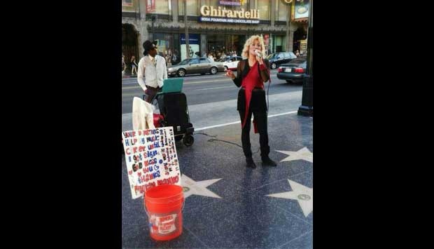 Pinkan Mambo berada di dekat kardus saweran saat ngamen di pinggir jalan
